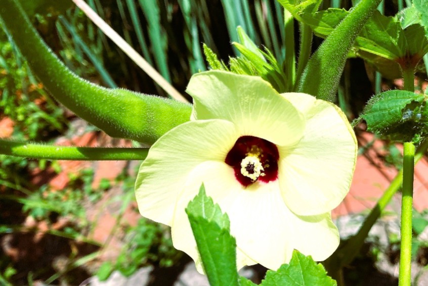 レモンイエローの薄い花びらに濃いワインレッド系のコントラストも美しい、オクラの花です。